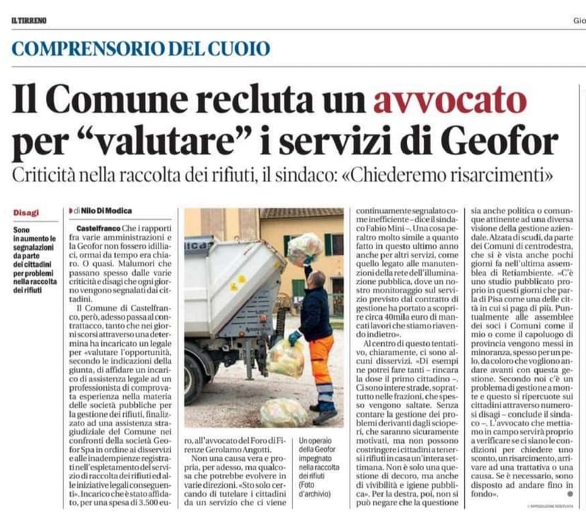 Un articolo di stampa riporta crescenti segnalazioni da parte dei cittadini per disagi nella raccolta dei rifiuti. L'amministrazione comunale sta reclutando un legale per affrontare le problematiche con il gestore Geofor.